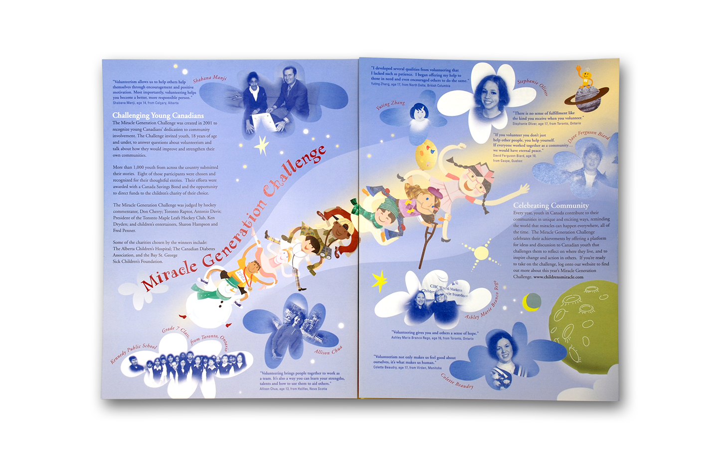 Design and illustration created for the “Miracle Day” - an annual international fund-raising event for CIBC World Markets Children’s Miracle Foundation. Design campaign items for each year include posters, brochures, invitations, T-shirt, web pages and souvenirs...etc. Each year’s campaign conveys a different concept through distinguished illustrative/photographic approach and design look & feel; but all the campaigns are created based on the same theme or message: to show the energy and hopes of children and that they are our best future investment