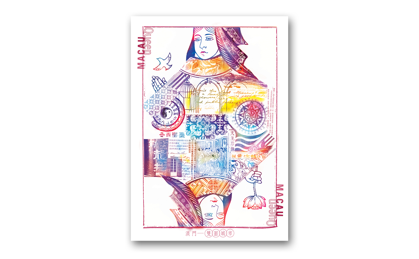 participate in the “Discover Asia” Poster Design Exhibition held by ICOGRADA, Taiwan in 2002. The concept of the Queen represents my feeling towards Macau. As a Macauese, I am so glad to have the design theme of my poster based on my home town. Macau, where I was born and brought up, has given me lots of strong personal qualities and unforgettable memories. In the foreigners', or especially the tourists' point of view, Macau is just another small gambling city. Macauese is just like one poker card, whom is always seen as plain, same pattern, never stood out in the crowd, not talking in the international level. But behind this "very little playing card", she has her own distinguished cutural characteristics; and the combination of freedom and tradition of east and west. There are just unlimited interesting qualities to be dicovered, which build me up and many other Macau people in around the world.