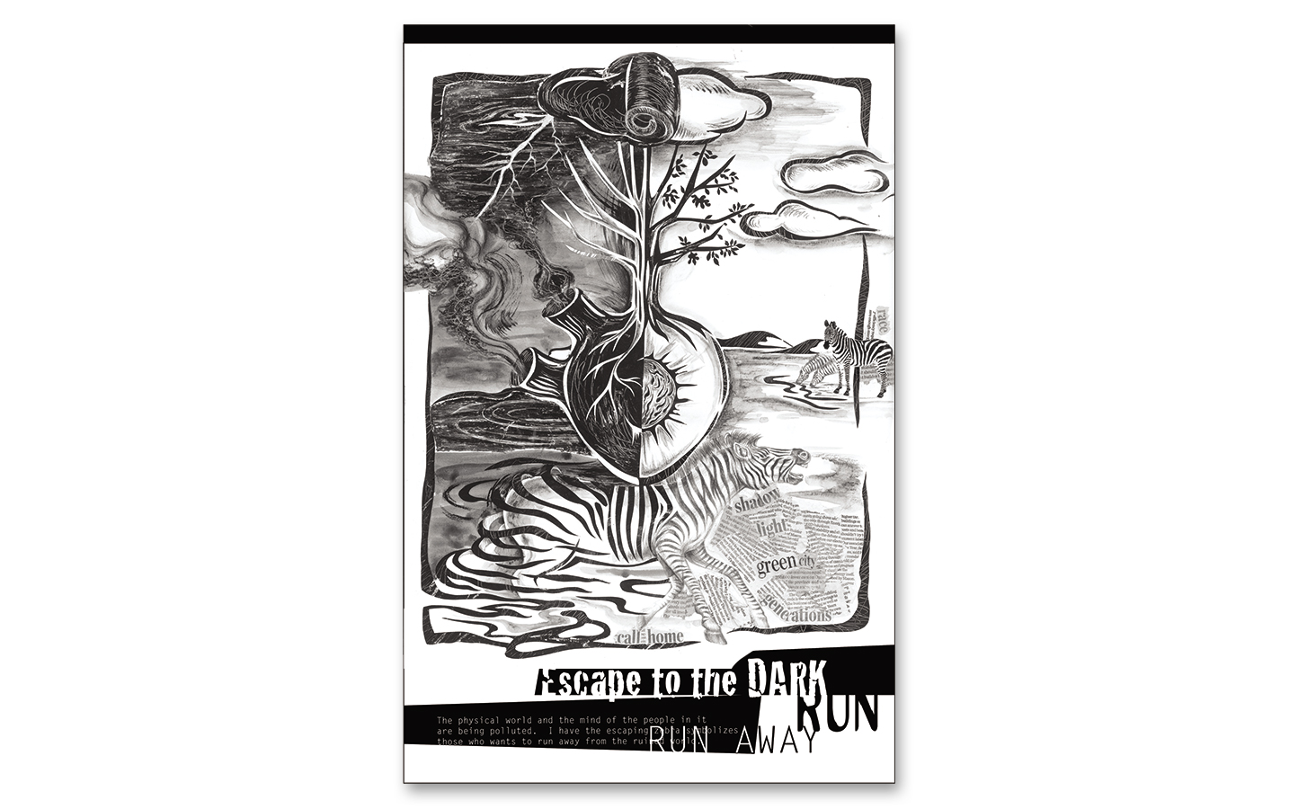 In my picture, I illustrated how the physical world and the mind of the people in it are being polluted. I have the escaping zebra symbolizes those who wants to run away from the ruined world.