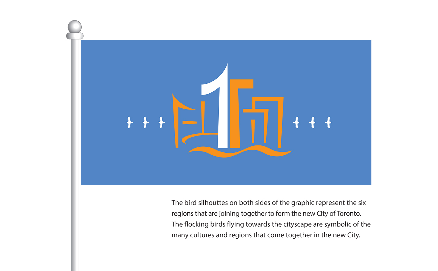 3. The bird silhouttes on both sides represent the six regions of the new City of Toronto and the multi-cultures that come together in the new City.