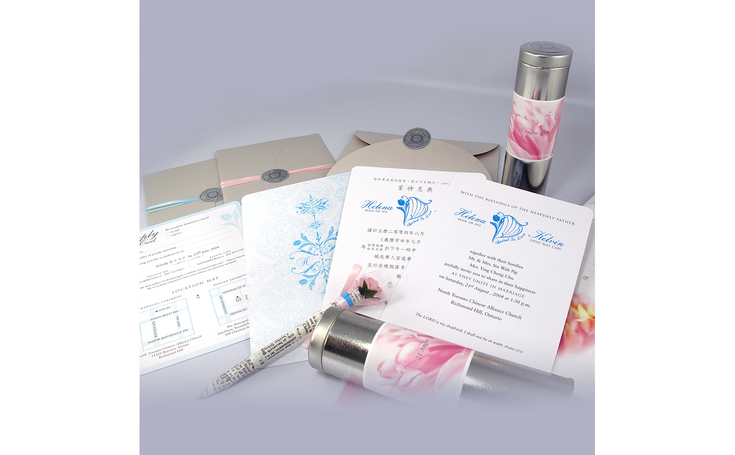 Wedding design series with the theme on "United in Love". Items include wedding symbol, invitation cards, souvenirs, magnets, CD case, cookie wraps and overall theme decoration of the wedding day.