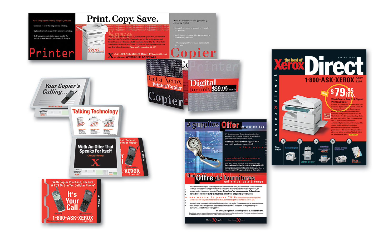 Print collaterals for DCI advertising campaign. Items include banners, brochures, folders, directmails, floor decals...etc. Works with Wilco Design and Sharpe Blackmore EURO RSCG on the advertising campaigns on “Xerox Direct” for Xerox Canada. Projects include creating different marketing materials such as presentation items, conference, pamphlet, newspaper and magazine ads and elements for Xerox branding.