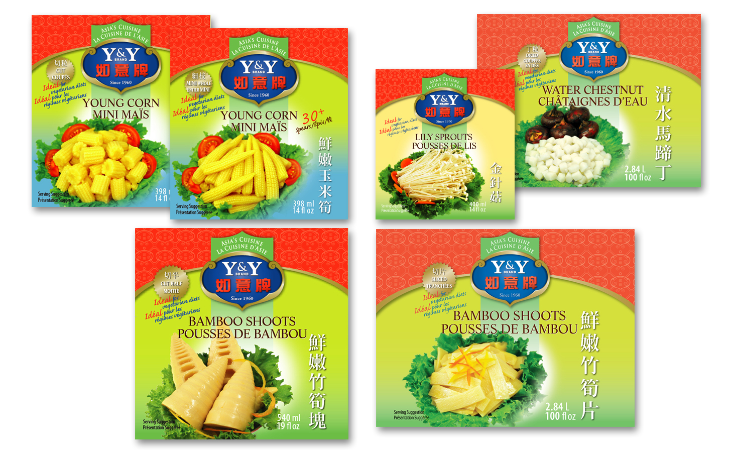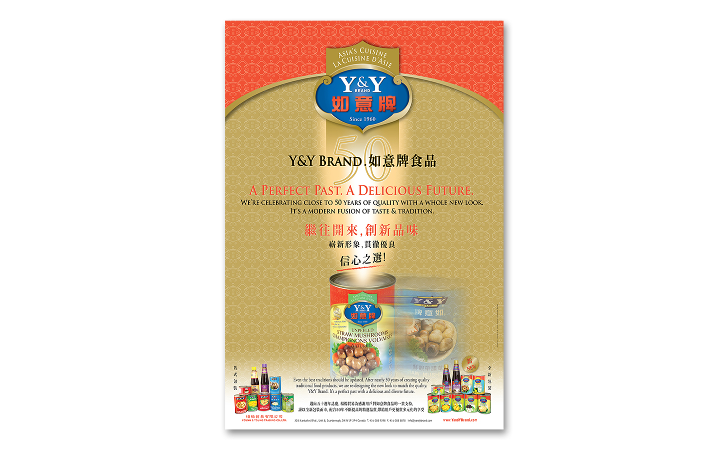 Redesign the complete branding system for the Y&Y Brand, a famous across Canada Asian food products in the market since 1960. The challenge is to refresh the product series with a more modern design, yet keeping the authentic and sophisticated look; and also to build up a strong and user-friendly product categorization system for more than 200 existing and expanding food lines. Design items include brand logo development, product categorizations & colour systems, branding applications on all packaging series, product photoshooting, news ads and web design.